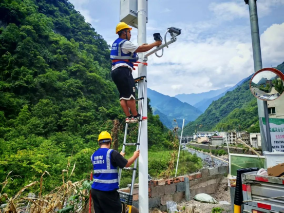 工人在峨边黑竹沟镇底底古村风险隐患点安装感知源设备