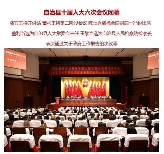自治县委书记、大会主席团常务主席、闭幕会执行主席漆宾主持闭幕会第一阶段会议。大会主席团常务主席、闭幕会执行主席董利主持闭幕会第二阶段会议。大会主席团常务主席、闭幕会执行主席曲别曲一、冯锐、万瑜、简先林、阿仲向阳、付加荣、吕军在主席台前排就座。