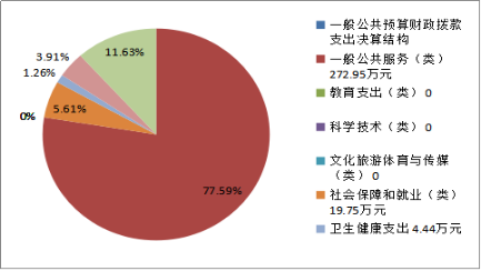 2019年一般公共预算财政拨款支出351.8万元,主要用于以下方面:一般公共服务(类)支出272.95万元,占77.59%;社会保障和就业(类)支出19.75万元,占5.61%;卫生健康支出4.44万元,占1.26%;住房保障支出13.74万元,占3.91%;农林水支出40.92,占11.63%。