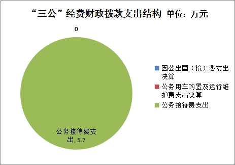 2019年“三公”经费财政拨款支出决算中,因公出国(境)费支出决算0万元,占0%;公务用车购置及运行维护费支出决算0万元,占0%;公务接待费支出决算5.7万元,占100%。具体情况如下: