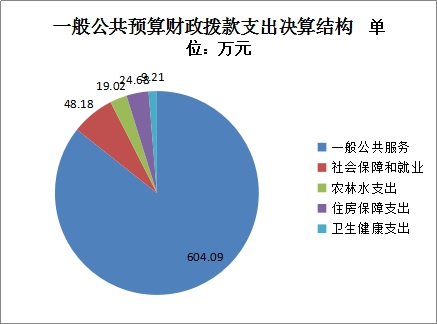 2019年一般公共预算财政拨款支出705.18万元,主要用于以下方面:一般公共服务(类)支出604.09万元,占85.66%;社会保障和就业(类)支出48.18万元,占6.83%;农林水支出(类)支出19.02万元,占2.7%;住房保障支出(类)24.68万元,占3.5%;卫生健康支出(类)支出9.21万元,占1.31%。