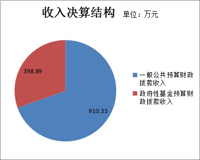 2019年本年收入合计1309.22万元,其中:一般公共预算财政拨款收入910.33万元,占69.53%;政府性基金预算财政拨款收入398.89万元,占30.47%;上级补助收入0万元,占0%;事业收入0万元,占0%;经营收入0万元,占0%;附属单位上缴收入0元,占0%;其他收入0万元,占0%。