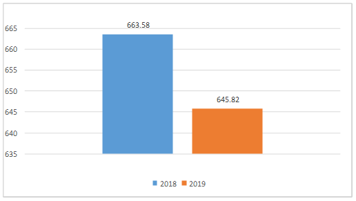 四、财政拨款收入支出决算总体情况说明 2019年财政拨款收、支总计645.82万元。与2018年相比,财政拨款收、支总计各减少17.76万元,下降2.68%。主要变动原因是2018年政府加大对教育的投入,配备教学实验仪器,推动教育信息化建设,大力改善办学条件等。 (图4:财政拨款收、支决算总计变动情况)(柱状图)