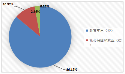 (二)一般公共预算财政拨款支出决算结构情况 2019年一般公共预算财政拨款支出591.41万元,主要用于以下方面:教育支出(类)509.33万元,占86.12%;社会保障和就业(类)支出64.9万元,占10.97%;卫生健康支出15.74万元,占2.66%;农林水支出(类)1.44万元,占0.25%。 (图6:一般公共预算财政拨款支出决算结构)(饼状图)