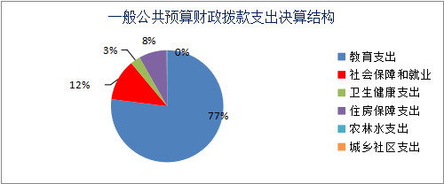 2020年一般公共预算财政拨款支出530.22万元,主要用于以下方面:教育支出(类)408.36万元,占77.02%;社会保障和就业(类)支出63.40万元,占11.95%;卫生健康支出15.21万元,占2.86%;住房保障支出42.42万元,占8.01%;农林水支出0.83万元,占0.16%。