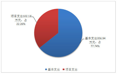 三、支出决算情况说明 2019年本年支出合计459.12万元,其中:基本支出356.94万元,占77.74%;项目支出102.18万元,占22.26%,上缴上级支出0万元,占0%;经营支出0万元,占0%;对附属单位补助支出0万元,占0%。