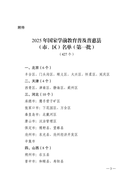 近日,教育部印发通知,公布2025年国家学前教育普及普惠县(市、区)名单。2025年第一批认定427个县(市、区)为国家学前教育普及普惠县。