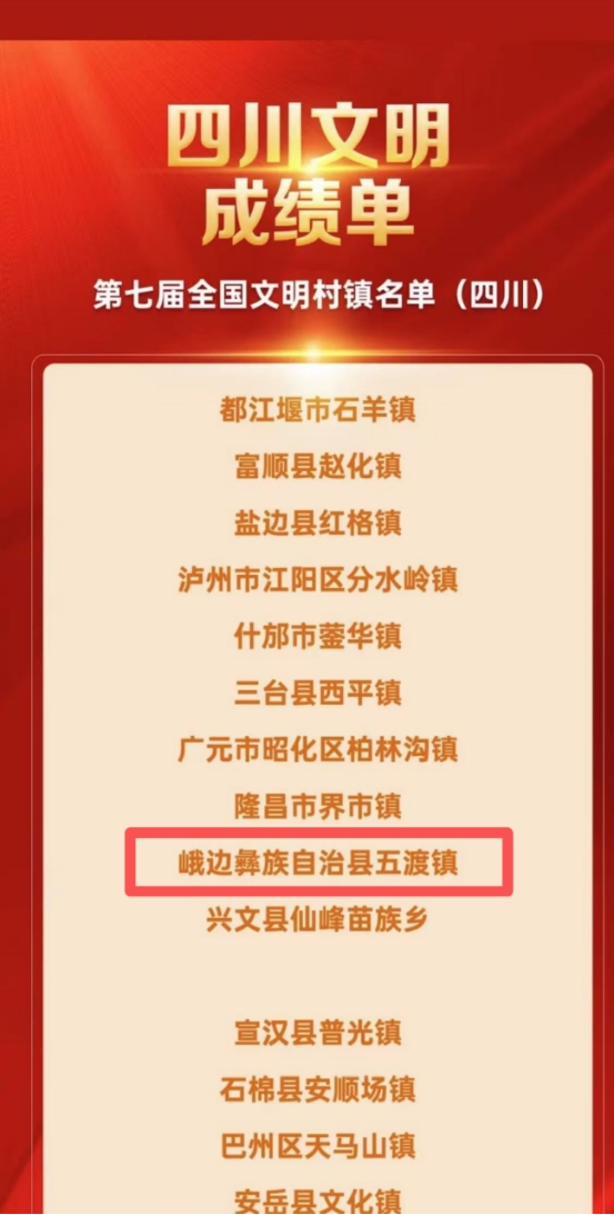 “十四五”期间,五渡镇锚定“党建引领、三区联动、城乡融合、全面振兴”思路,乡村振兴成效显著。镇域获评乐山市乡村振兴先进乡镇、全市首批城乡基层治理示范乡镇、全省天然氧吧,2025年成功创建第七届全国文明村镇;铜河村斩获全国民主法治示范村、四川省乡村治理示范村等国省市荣誉,2024年获全市基层群众自治优秀案例。