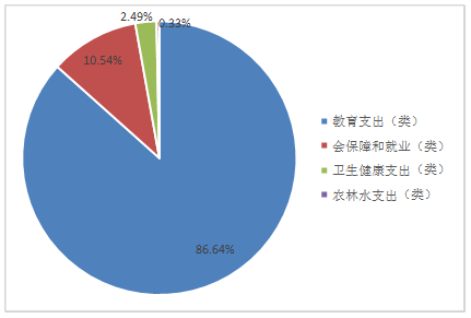 (二)一般公共预算财政拨款支出决算结构情况 2019年一般公共预算财政拨款支出843.56万元,主要用于以下方面:教育支出(类)730.82万元,占86.64%;社会保障和就业(类)支出88.88万元,占10.54%;卫生健康支出21.08万元,占2.49%;住房保障支出2.78万元,占0.33%。