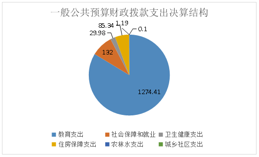 2020年一般公共预算财政拨款支出1523.01万元,主要用于以下方面:教育支出(类)1274.41万元,占83.66%;社会保障和就业(类)支出132万元,占8.67%;卫生健康支出29.98万元,占1.97%;住房保障支出85.34万元,占5.6%;农林水支出(类)1.19万元,占0.07%,城乡社区支出0.1万元,占0.01%。