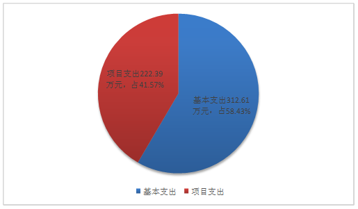 三、 支出决算情况说明 2019年本年支出合计535万元,其中:基本支出312.61万元,占58.43%;项目支出222.39万元,占41.57%,上缴上级支出0万元,占0%;经营支出0万元,占0%;对附属单位补助支出0万元,占0%。