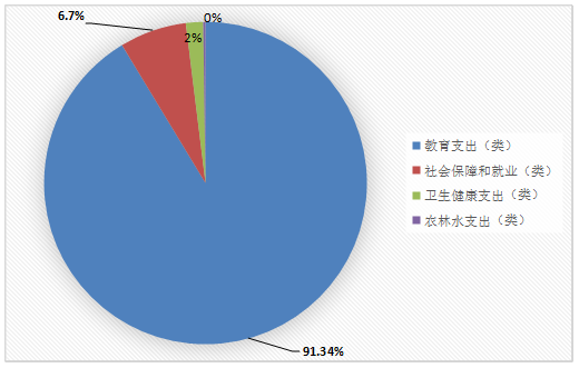 (二)一般公共预算财政拨款支出决算结构情况 2019年一般公共预算财政拨款支出535万元,主要用于以下方面:教育支出(类)488.69万元,占91.34%;社会保障和就业(类)支出35.85万元,占6.7%;卫生健康支出(类)9.24万元,占1.73%;农林水支出(类)1.22万元,占0.23%。