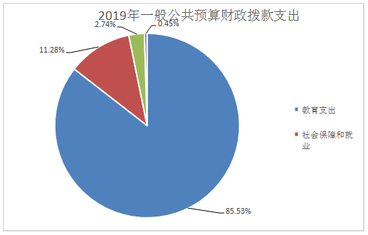 (三)一般公共预算财政拨款支出决算具体情况 2019年一般公共预算支出决算数为901.43万元,完成预算89.78%。其中: 1.教育(类)教育管理事务(款)其他教育管理事务支出(项): 支出决算为4.2万元,完成预算100%。 2.教育(类)普通教育(款)学前教育(项): 支出决算为47.49万元,完成预算85%,决算数小于预算数的主要原因是年末结转8.56万元 3.教育(类)普通教育(款)小学教育(项): 支出决算为57.83万元,完成预算51%,决算数小于预算数的主要原因是学校年末结转55万元。 4.教育(类)普通教育(款)初中教育(项): 支出决算为572.79万元,完成预算99%,决算数小于预算数的主要原因是学校年末结转4.48万元 5.教育(类)普通教育(款)高中教育(项): 支出决算为0.37万元,完成预算100%。 6.教育(类)普通教育(款)其他普通教育支出(项): 支出决算为54.64万元,完成预算80%。决算数小于预算数的主要原因是学校年末结转13.66万元。 7.教育(类)职业教育(款)职业高中教育(项): 支出决算为1.19万元,完成预算100%。 8.教育(类)教育费附加安排的支出(款)其他教育费附加安排的支出(项): 支出决算为32.47万元,完成预算61%,决算数小于预算数的主要原因是学校年末结转20.49万元 9.社会保障和就业(类)行政事业单位离退休(款)机关事业单位基本养老保险缴费支出(项): 支出决算为66.25万元,完成预算100%。 10.社会保障和就业(类)行政事业单位离退休(款)机关事业单位职业年金缴费支出(项): 支出决算为30.56万元,完成预算100%。 11.医疗卫生与计划生育(类)行政事业单位医疗(款)事业单位医疗(项):支出决算为24.67万元,完成预算100%。 12.农林水支出(类)扶贫(款)其他扶贫支出(项):支出决算为4.09万元,完成预算90%,决算数小于预算数的主要原因是学校年末结转0.45万元。