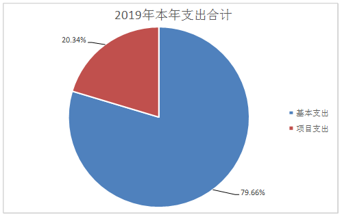 三、 支出决算情况说明 2019年本年支出合计901.43万元,其中:基本支出718.04万元,占79.66%;项目支出183.39万元,占20.34%,上缴上级支出0万元,占0%;经营支出0万元,占0%;对附属单位补助支出0万元,占0%。
