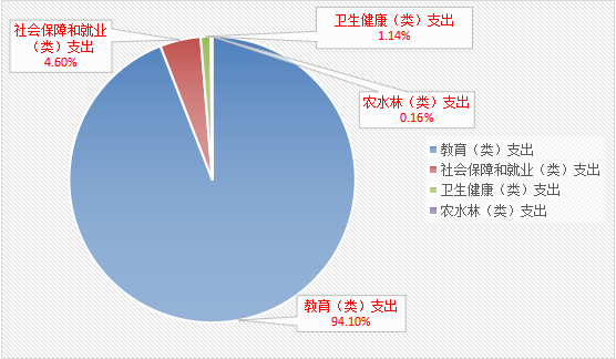 (二)一般公共预算财政拨款支出决算结构情况 2019年一般公共预算财政拨款支出1062.91万元,主要用于以下方面:教育(类)支出1000.18万元,占94.10%;社会保障和就业(类)支出48.83万元,占4.60%;卫生健康(类)支出12.15万元,占1.14%;农林水(类)支出1.75万元,占0.16%。