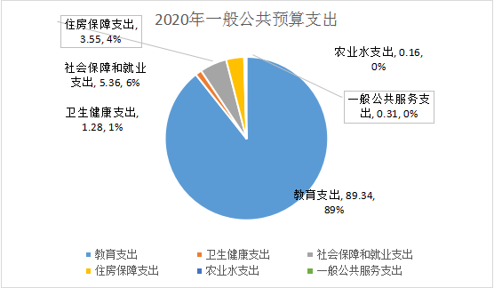 2020年一般公共预算财政拨款支出951.54万元,主要用于以下方面:一般公共服务(类)支出2.96万元,占0.31%;教育支出(类)850.07万元,占89.34%;社会保障和就业(类)支出50.98万元,占5.36%;卫生健康支出12.20万元,占1.28%;住房保障支出33.78万元,占3.55%;农林水支出1.55万元,占0.16%。